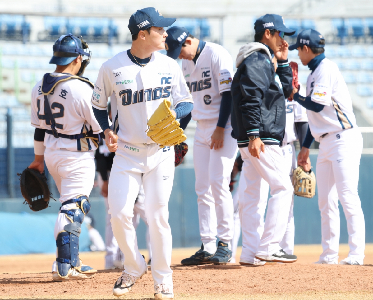 NC 하준영이 연속 안타를 맞고 교체되고 있다.