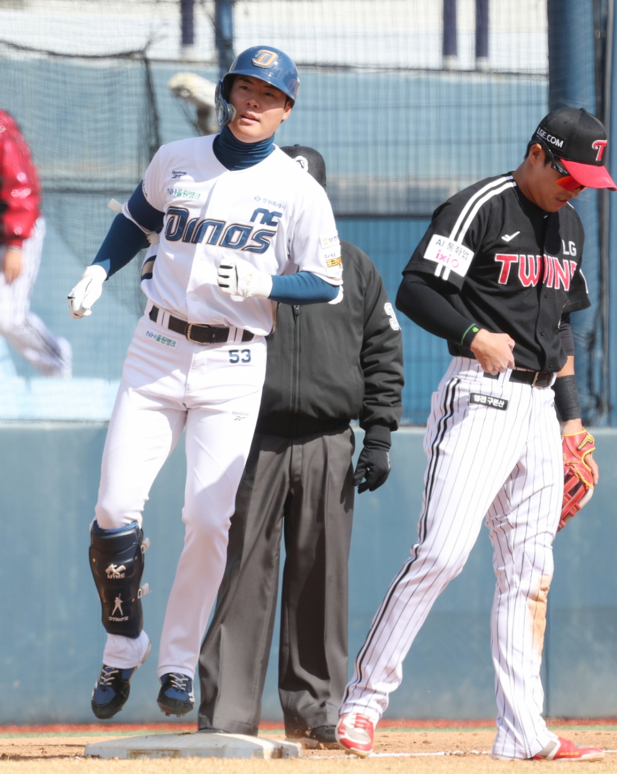 2026 신한 SOL Bank KBO리그 시범경기 NC 다이노스와 LG 트윈스의 경기가 13일 경남 창원시 마산야구장에서 열렸다. NC 박시원은 7회초 1사 1루 상황에서 2루타를 기록했다. 박시원은 수비 실책을 이용해 3루까지 진루했다.