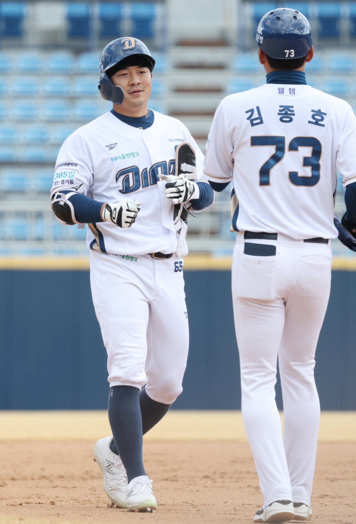 2026 신한 SOL Bank KBO리그 시범경기 NC 다이노스와 LG 트윈스 경기가 13일 경남 창원시 마산야구장에서 열렸다. NC 오장한은 8회말 1타점 적시 2루타를 날렸다. 오장한은 출루 후 김종호 코치의 환영을 받았다.