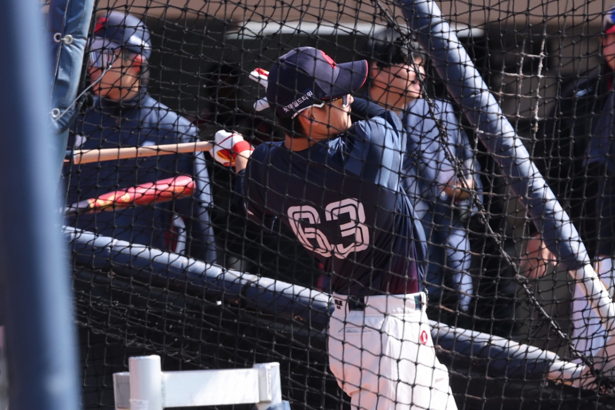 2026 신한 SOL Bank KBO리그 시범경기 롯데 자이언츠 대 LG 트윈스 경기가 14일 부산 사직야구장에서 열렸다. 롯데 이서준이 타격 훈련을 했다. 이서준은 '내일을 향해 쏜다'는 제목으로 포착되었다.