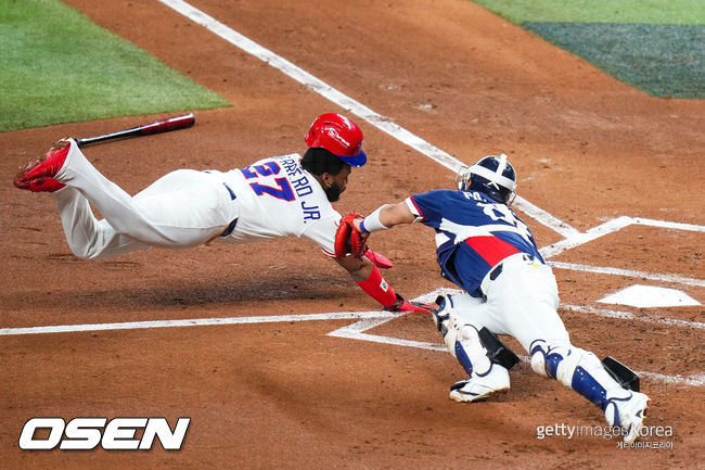 하지만 결과는 달라지지 않았다. 게레로 주니어는 베이스를 돌며 홈으로 질주했다. 홈으로 파고드는 과정에서 약간 미끄러지는 모습도 보였지만 송구가 라인 쪽으로 살짝 치우친 사이 공중으로 몸을 던지며 태그를 가까스로 피해 도미니카 공화국의 첫 득점을 만들어냈다.