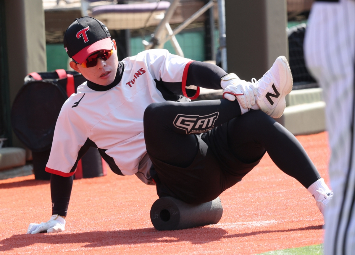 LG 문성주가 스트레칭 훈련을 하고 있다.