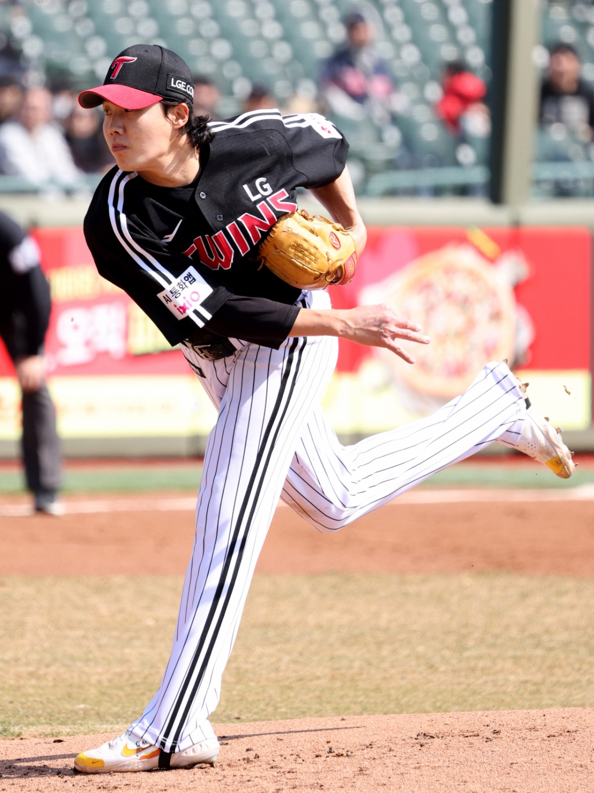 2026 신한 SOL Bank KBO리그 시범경기 롯데 자이언츠 대 LG 트윈스 경기가 14일 부산 사직야구장에서 열렸다. LG 선발 임찬규가 역투했다. 기사는 임찬규의 역동적인 피니시를 포착했다.