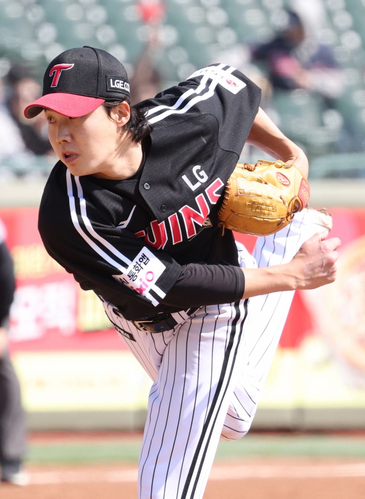 2026 신한 SOL Bank KBO리그 시범경기 롯데 자이언츠 대 LG 트윈스 경기가 14일 부산 사직야구장에서 열렸다. LG 선발 임찬규가 역투했다. 임찬규는 '부드러운 카리스마'를 보여주었다.