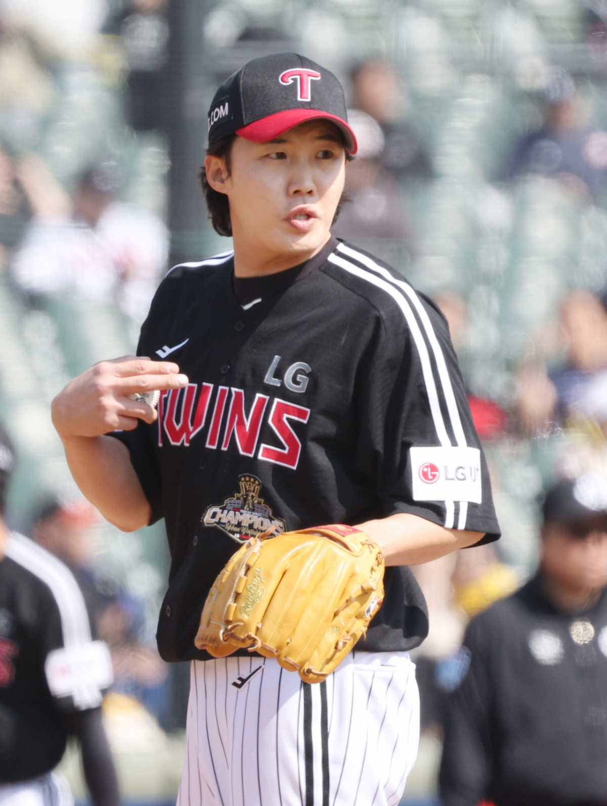 LG 선발 임찬규가 야수들에게 사인을 보내고 있다.