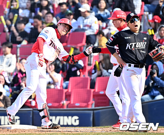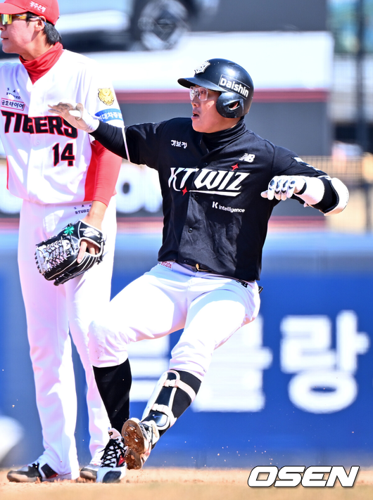 기세가 살아난 KIA는 7회 뒤집었다. 김석환 볼넷에 이어 윤도현이 왼쪽 담장 2루타를 쳤다. 김규성과 주효상이 내야땅볼에 그쳤으나 박민이 1루와 2루 사이를 꿰뚫는 적시타를 날려 9-7로 앞섰다. 정현창이 또 유격수 실책으로 살아나자 박재현이 1루수 옆으로 빠지는 적시타를 터트려 한 점을 보탰다. KT도 끈질겼다. 배정대가 8회초 투런포로 추격했고 안치영이 9회 2사1,3루에서 동점적시타를 날렸다.