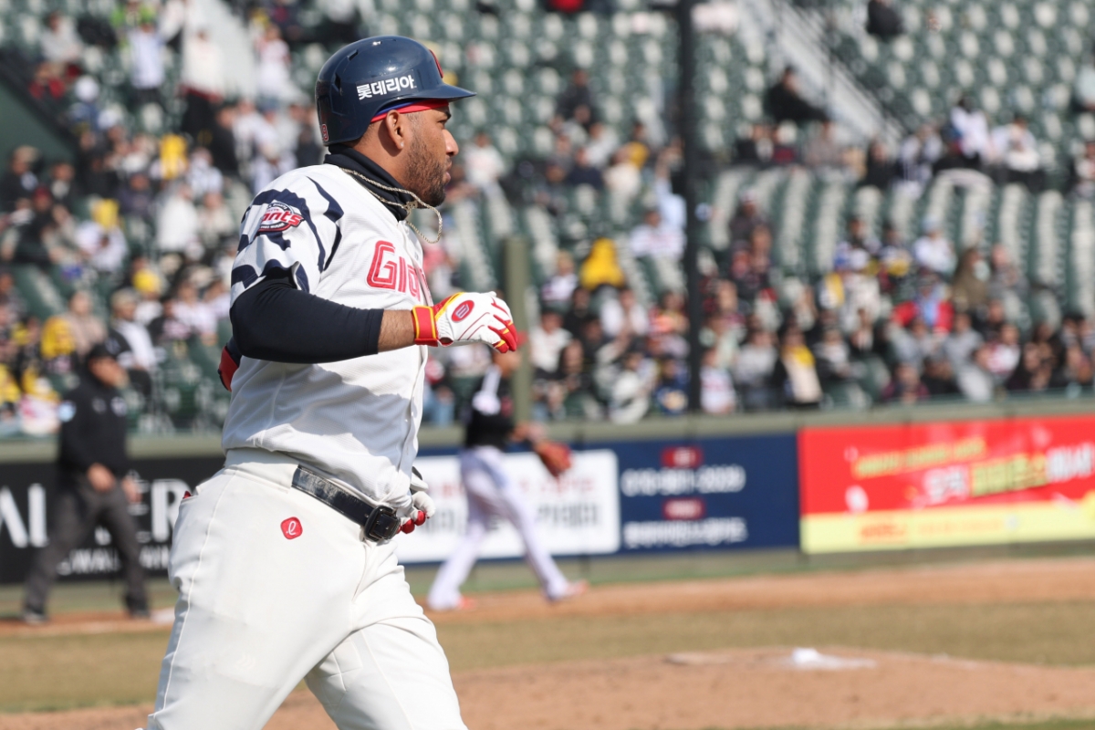 롯데 레이예스가 7회말 1사 1루에서 대타로 나와 중전 안타를 날리고 출루하고 있다.