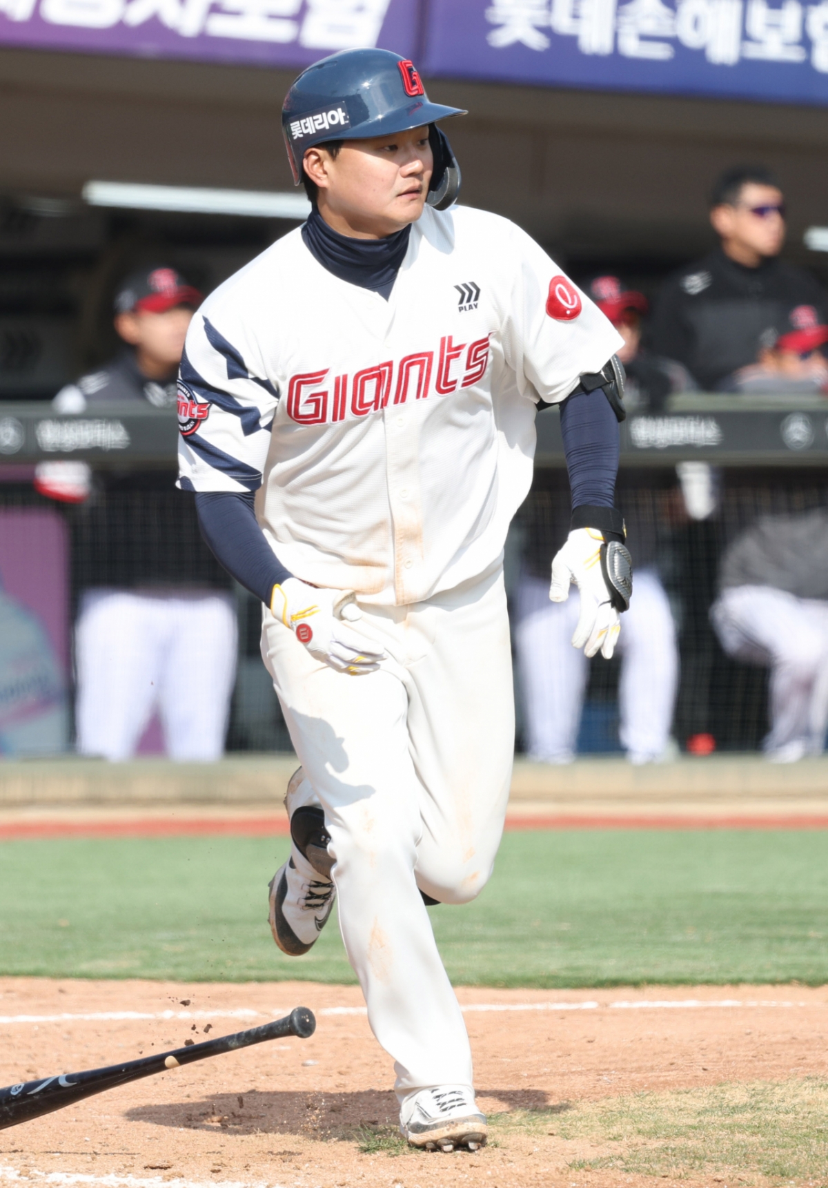 2026 신한 SOL Bank KBO리그 시범경기 롯데 자이언츠 대 LG 트윈스 경기가 14일 부산 사직야구장에서 열렸다. 롯데 손호영이 힘차게 타격한 후 질주했다. 이 경기는 시범경기였다.