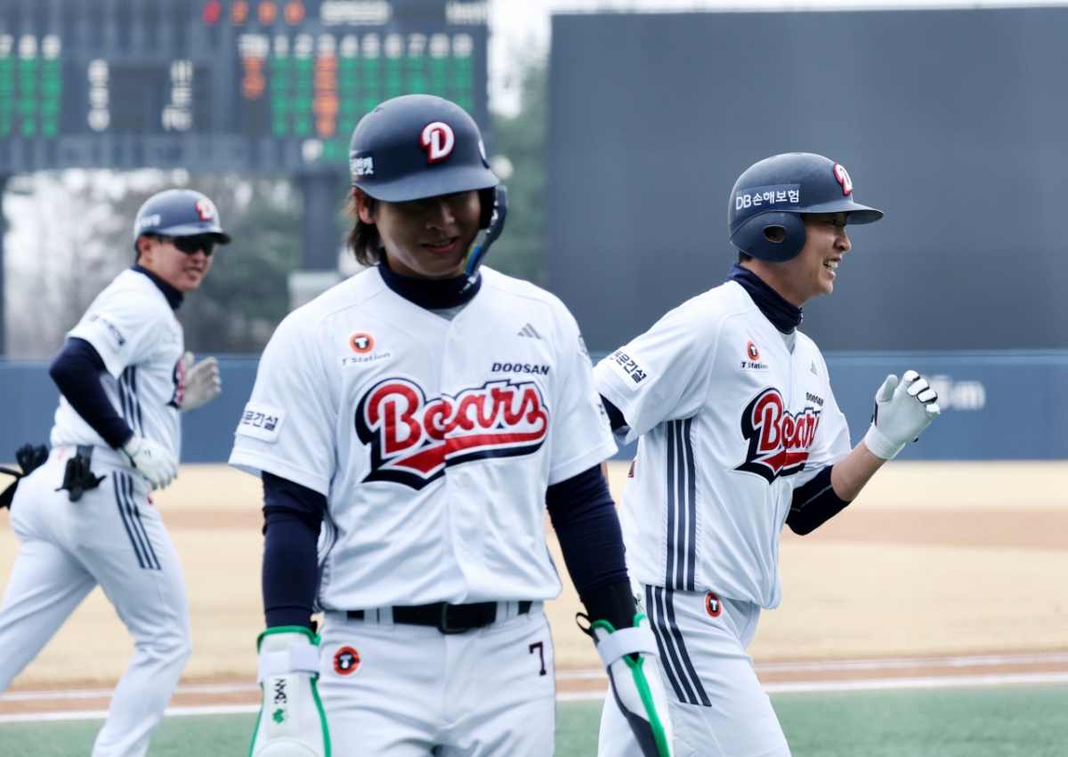 두산 2번타자 정수빈이 15일 이천 두산베어스파크에서 열린 2026 프로야구 시범경기 두산베어스와 삼성라이온즈 경기 1회말 임기영을 상대로 투런홈런을 터트린 후 홈인하고 있다. 2026.03.15.