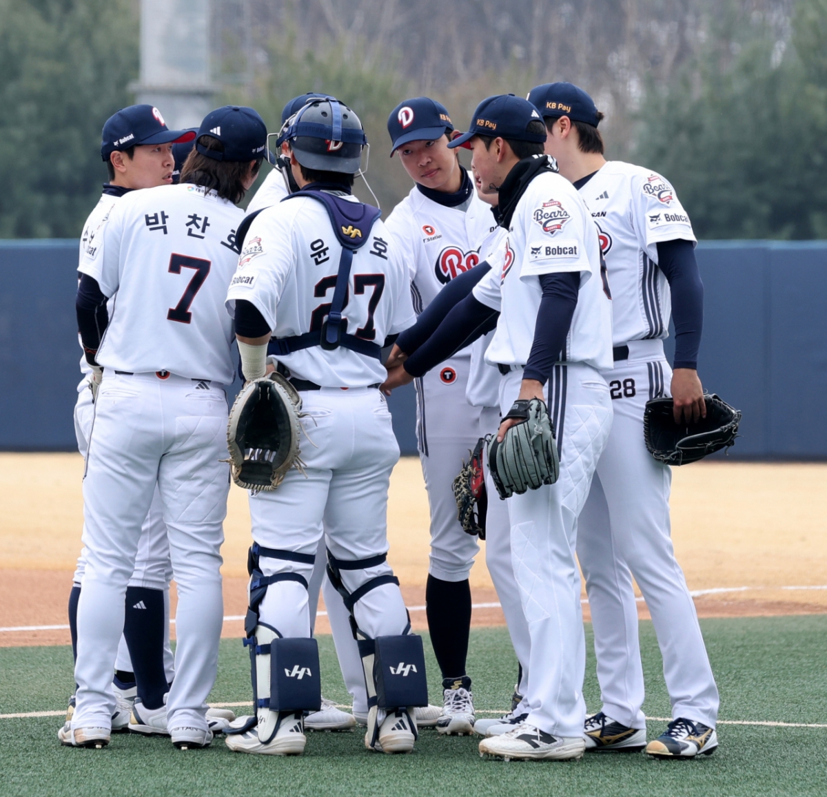2026년 3월 15일, 이천 두산베어스파크에서 2026 프로야구 시범경기가 열렸다. 두산베어스와 삼성라이온즈의 경기였다. 두산 선수들은 1회초 수비를 위해 그라운드로 나섰다.