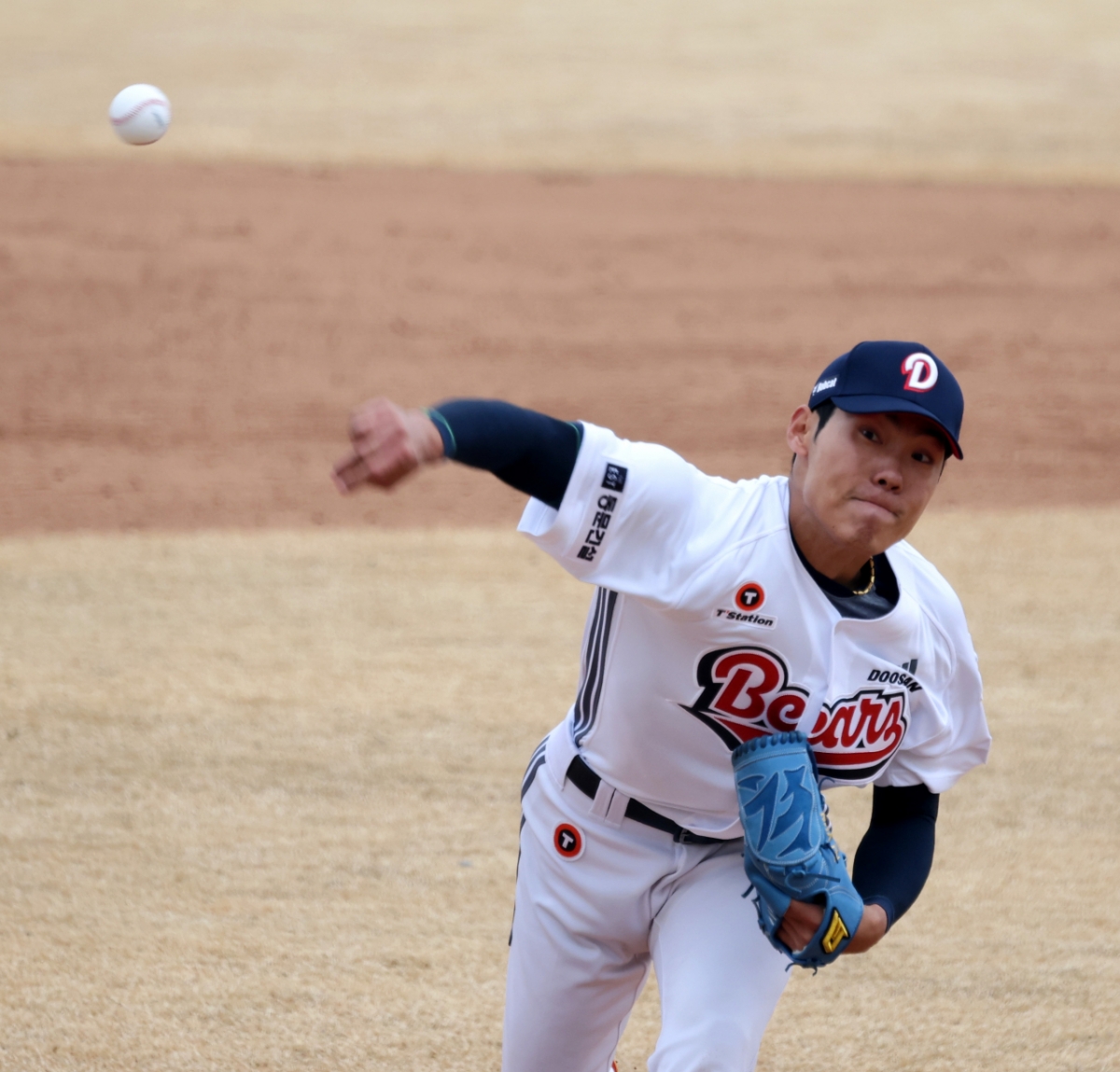 두산 우완투수 윤태호가이 15일 이천 두산베어스파크에서 열린 2026 프로야구 시범경기 두산베어스와 삼성라이온즈 경기에서 역투하고 있다. 2026.03.15.