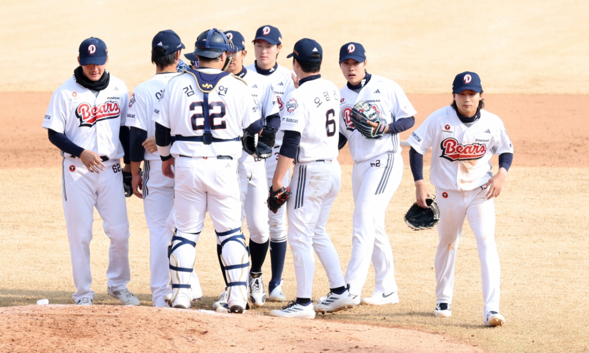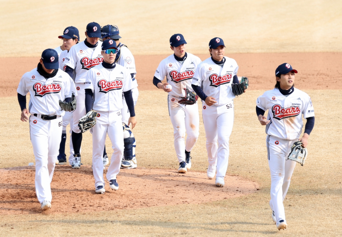 두산 선수들이 15일 이천 두산베어스파크에서 열린 2026 프로야구 시범경기 두산베어스와 삼성라이온즈 경기에서 승리한 후 그라운드로 나서고 있다. 2026.03.15.