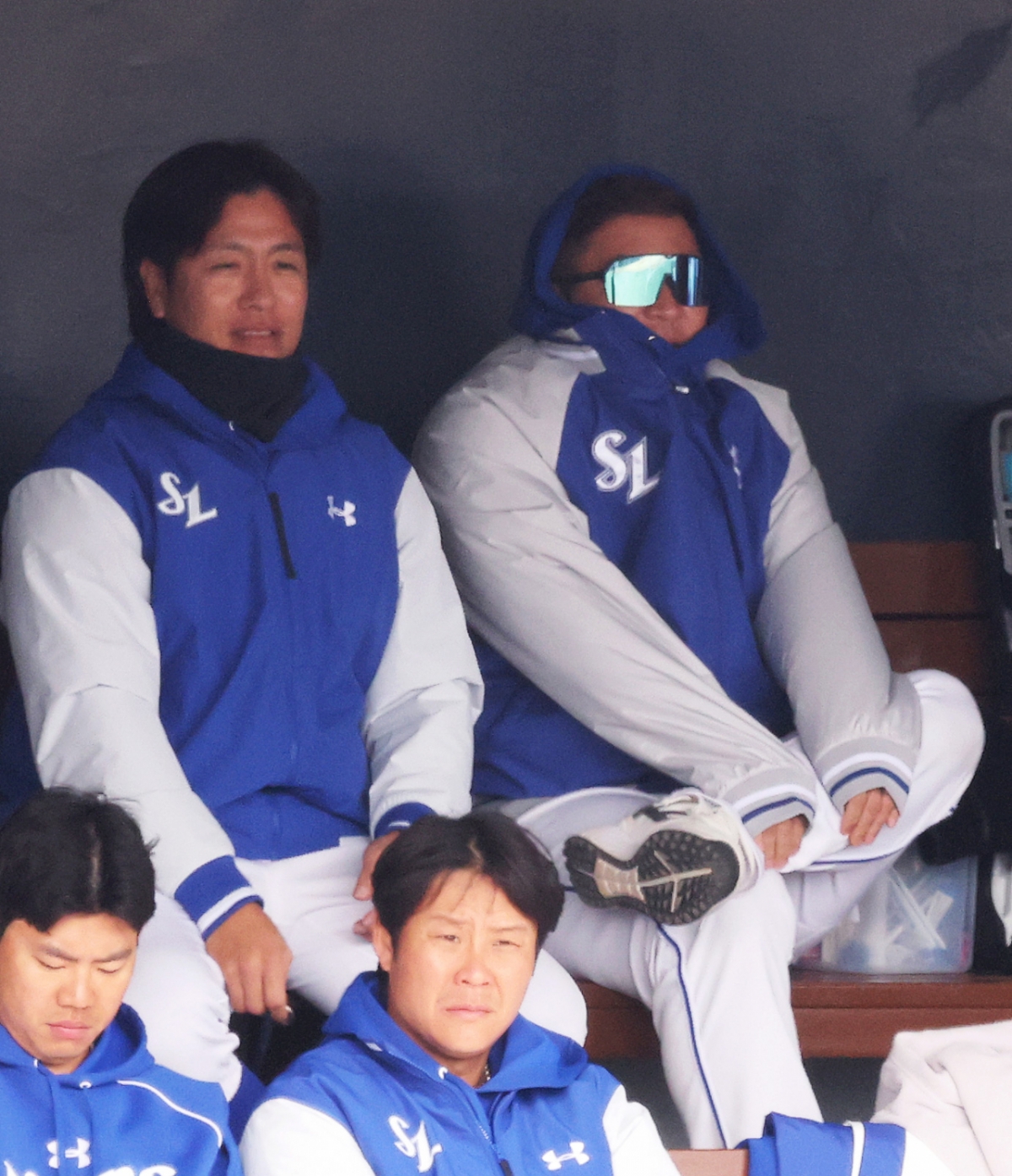 삼성 최형우가 15일 이천 두산베어스파크에서 열린 2026 프로야구 시범경기 두산베어스와 삼성라이온즈 경기에서 선발에 제외된 가운데 강민호와 경기를 지켜보고 있다. 2026.03.15.