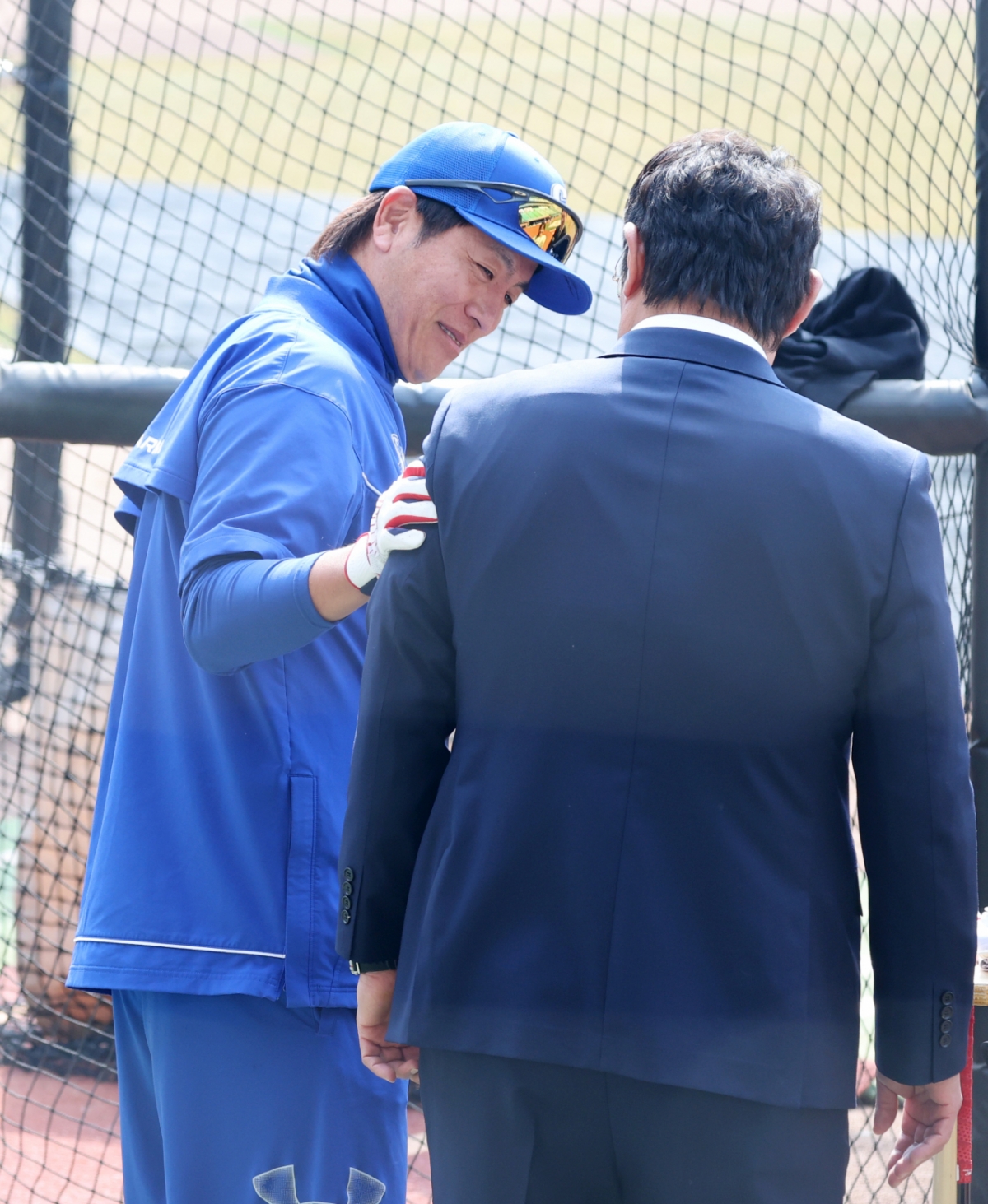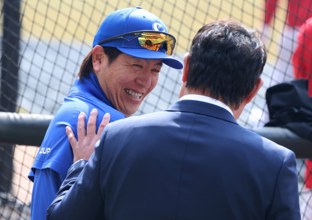삼성 포수 강민호가 16일 인천SSG랜더스필드에서 열린 2026 프로야구 시범경기 SSG랜더스와 삼성라이온즈 경기에 앞서 타격훈련을 하던중 최준석 해설위원과 이야기를 나누고 있다. 2026.03.16