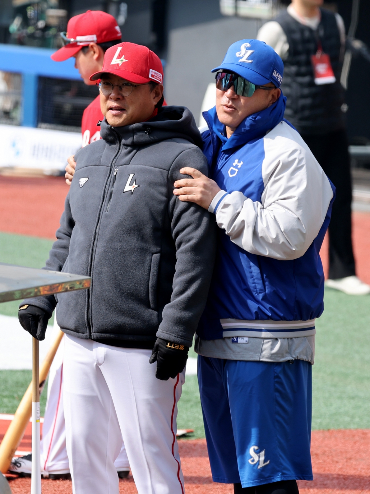 삼성 베테랑 최형우가 16일 인천SSG랜더스필드에서 열린 2026 프로야구 시범경기 SSG랜더스와 삼성라이온즈 경기에 앞서 ㄴSSG 송신영 코치와 이야기를 나누고 있다. 2026.03.16