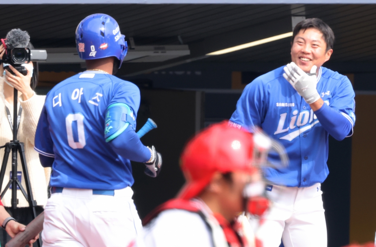 삼성 4번 디아즈가 16일 인천SSG랜더스필드에서 열린 2026 프로야구 시범경기 SSG랜더스와 삼성라이온즈 경기 6회초 문승원을 상대도 솔로홈런을 터트린 후 홈인하고 있다. 2026.03.16