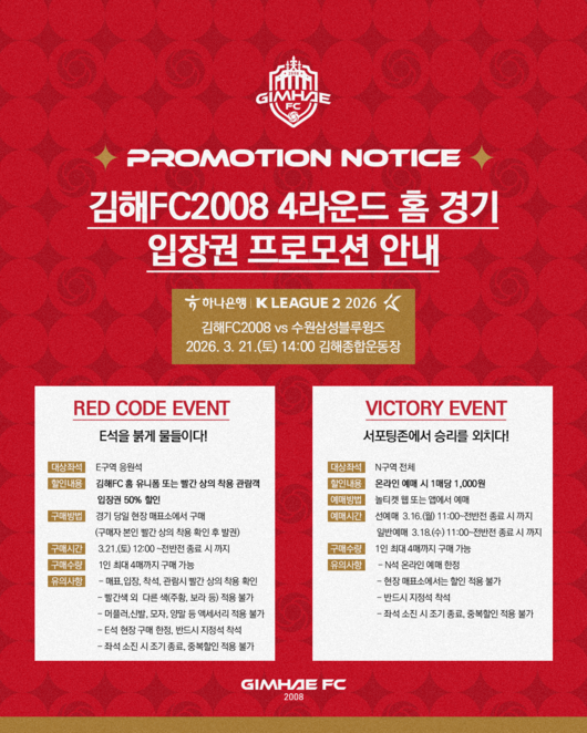 [OSEN=우충원 기자] 김해FC2008이 오는 21일 오후 2시 김해종합운동장에서 열리는 수원삼성블루윙즈와의 ‘하나은행 K리그2 2026’ 4라운드 홈 경기를 앞두고, 첫 승을 기원하는 대대적인 할인 프로모션을 진행한다고 밝혔다.