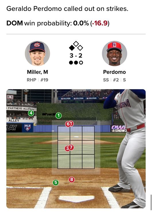 심판의 도움(?)도 받았다. 미국은 1점 차 앞선 9회 2사 3루 위기에 몰렸으나 마무리 투수 메이슨 밀러가 헤라르도 페르도모와 풀카운트 끝에 루킹 삼진을 잡아내며 경기를 끝냈다. 중계 화면은 물론 메이저리그 게임데이 중계 그래픽에도 스트라이트 존을 크게 벗어난 명백한 볼이었다.