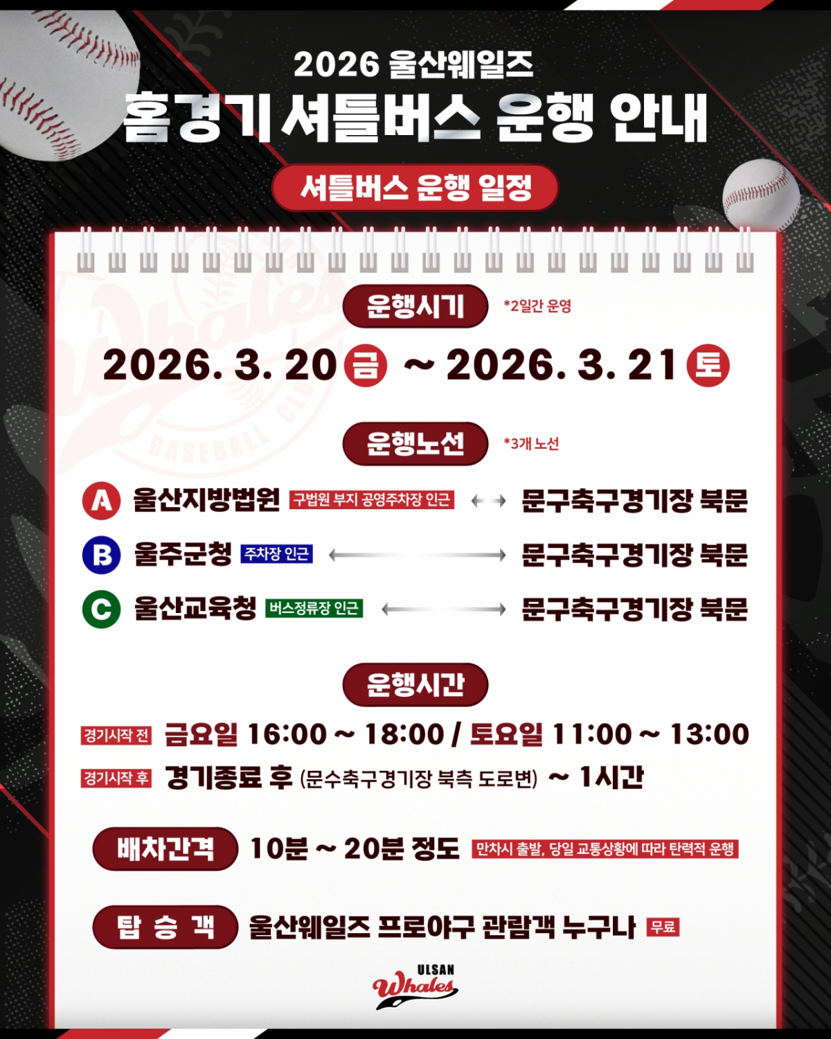 울산 웨일즈 프로야구단이 역사적인 창단 첫 홈 개막전을 맞아 관람객 편의를 위해 무료 셔틀버스를 운영한다.