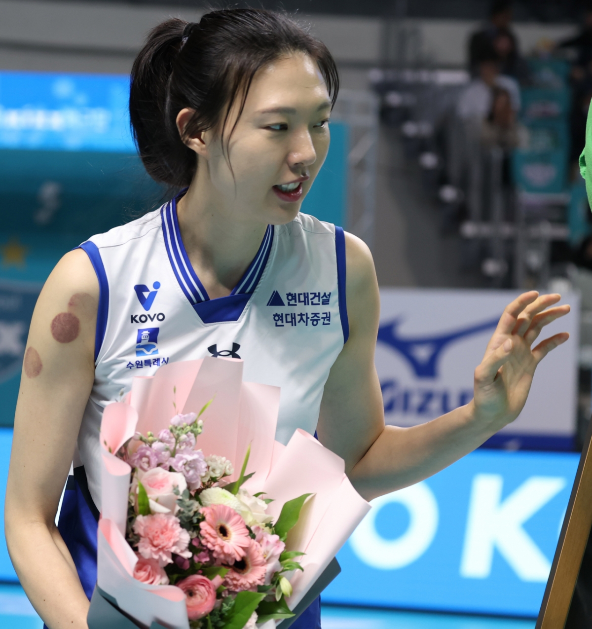 은퇴식을 한 현대건설 이다현이 GS칼텍스 이영택 감독과 주장 유서연으로부터 꽃다발과 대형 액자를 받은 후 기념촬영을 하고 있다.