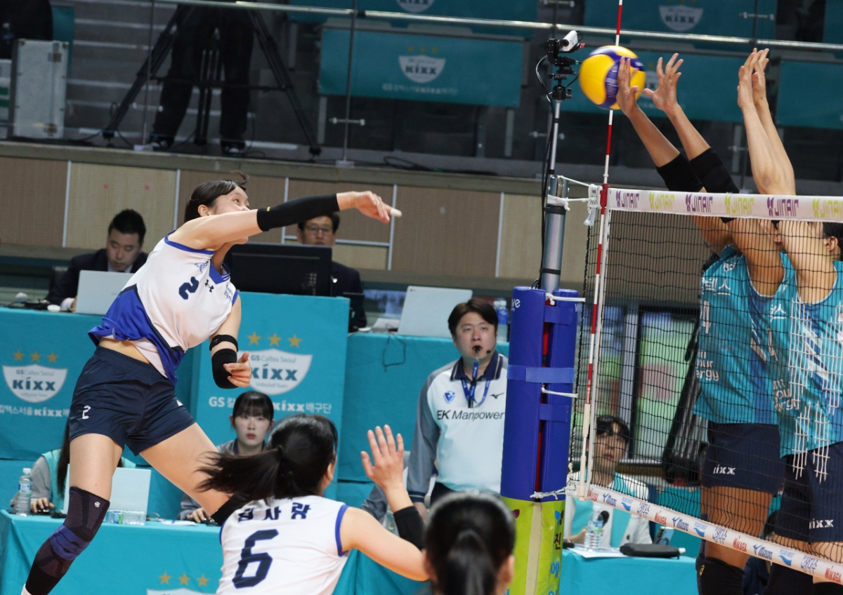 현대건설 이채영이 GS칼텍스 더블 블로킹 위로 강스파이크를 날리고 있다.