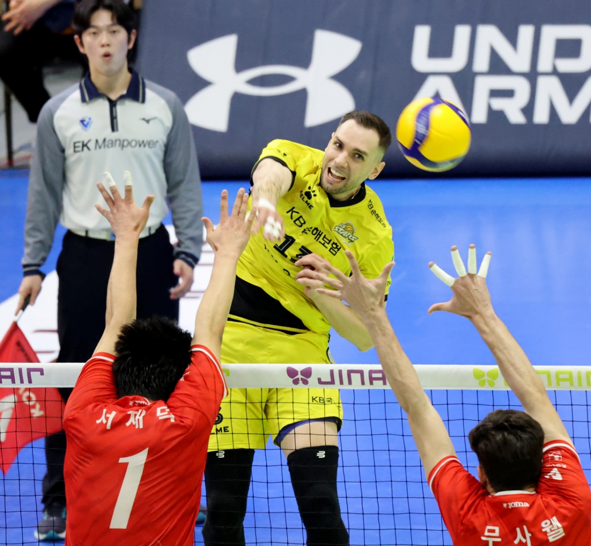 KB 비예나가 18일 수원체육관에서 열리는 2025-2026 V리그 한국전력과 KB손해보험 최종전에서 한전 이중블로킹을 피해 강타를 터트리고 있다. 2026.03.18.