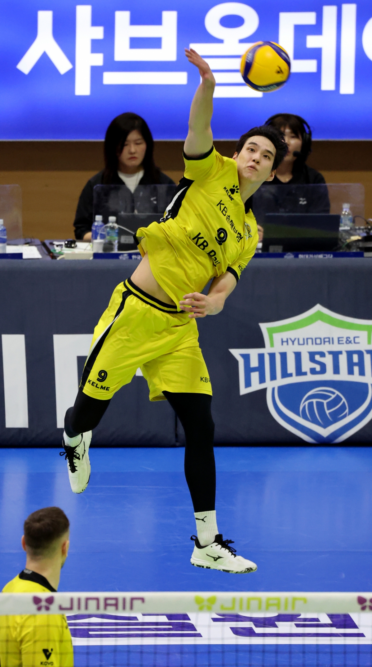 KB 임성진이 18일 수원체육관에서 열리는 2025-2026 V리그 한국전력과 KB손해보험 최종전에서 스파이크서브를 시도하고 있다. 2026.03.18.