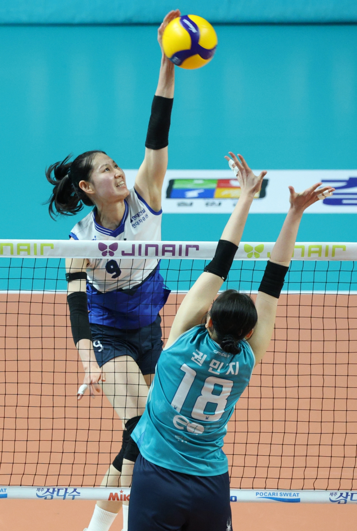2025-2026시즌 V리그 여자부 GS칼텍스와 현대건설의 경기가 18일 서울 장충체육관에서 열렸다. 현대건설 나현수는 GS칼텍스 권민지의 블로킹 위로 강스파이크를 날렸다. 이 경기는 V리그 여자부 경기였다.