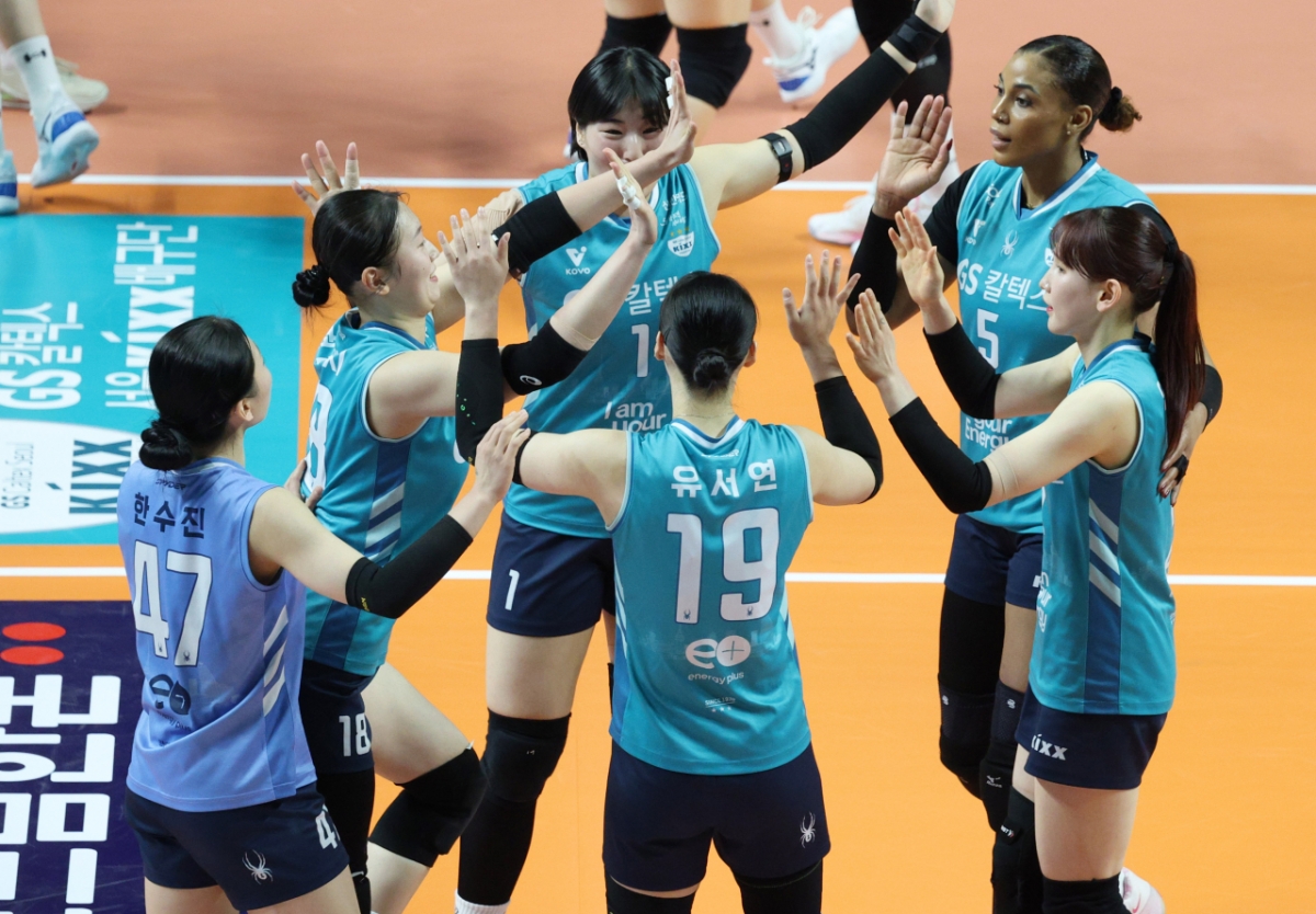 2025-2026시즌 V리그 여자부 GS칼텍스와 현대건설의 경기가 서울 장충체육관에서 열렸다. GS칼텍스 권민지가 블로킹 득점을 기록했다. 권민지는 득점 후 동료들과 함께 기뻐했다.