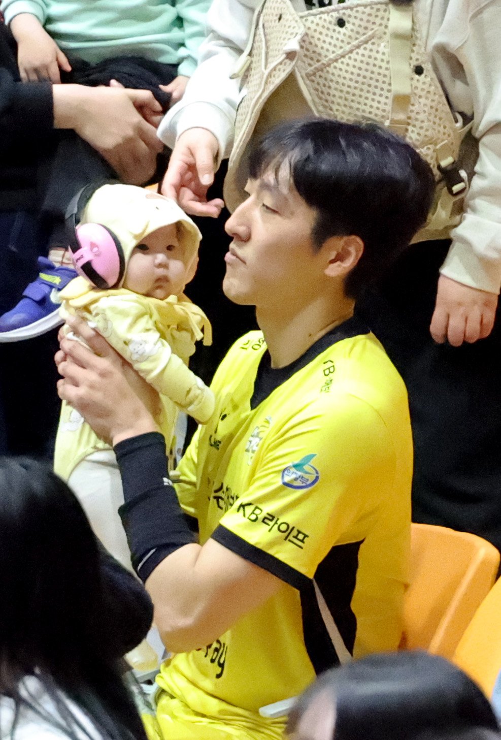 KB 차영석이 18일 수원체육관에서 열린 2025-2026 V리그 한국전력과 KB손해보험 최종전에서 세트스코어 3-0으로 승리하며 봄배구에 승선한 후 관중석에 올라가 갓난아기를 안으며 자축하고 있다. 2026.03.18.