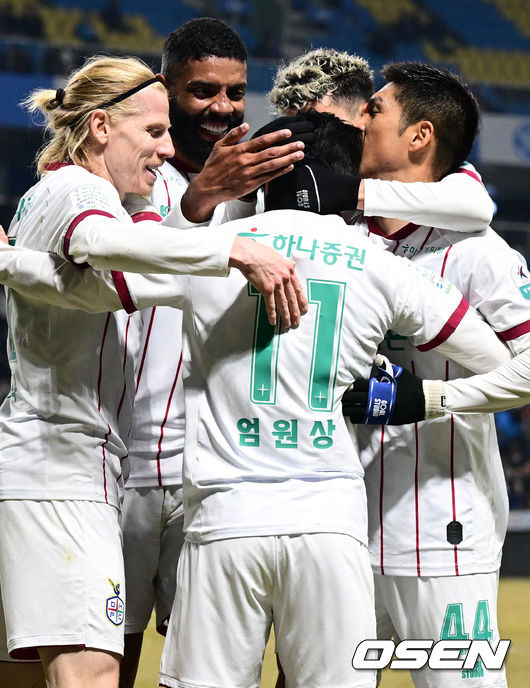 18일 오후 인천축구전용경기장에서 '하나은행 K리그1 2026' 4라운드 인천 유나이티드와 대전 하나시티즌의 경기가 열렸다. 인천은 1무 2패로 리그 10위, 대전은 3무로 7위에 올라 있었다. 후반 대전 엄원상의 골에 대전이 기뻐했다.