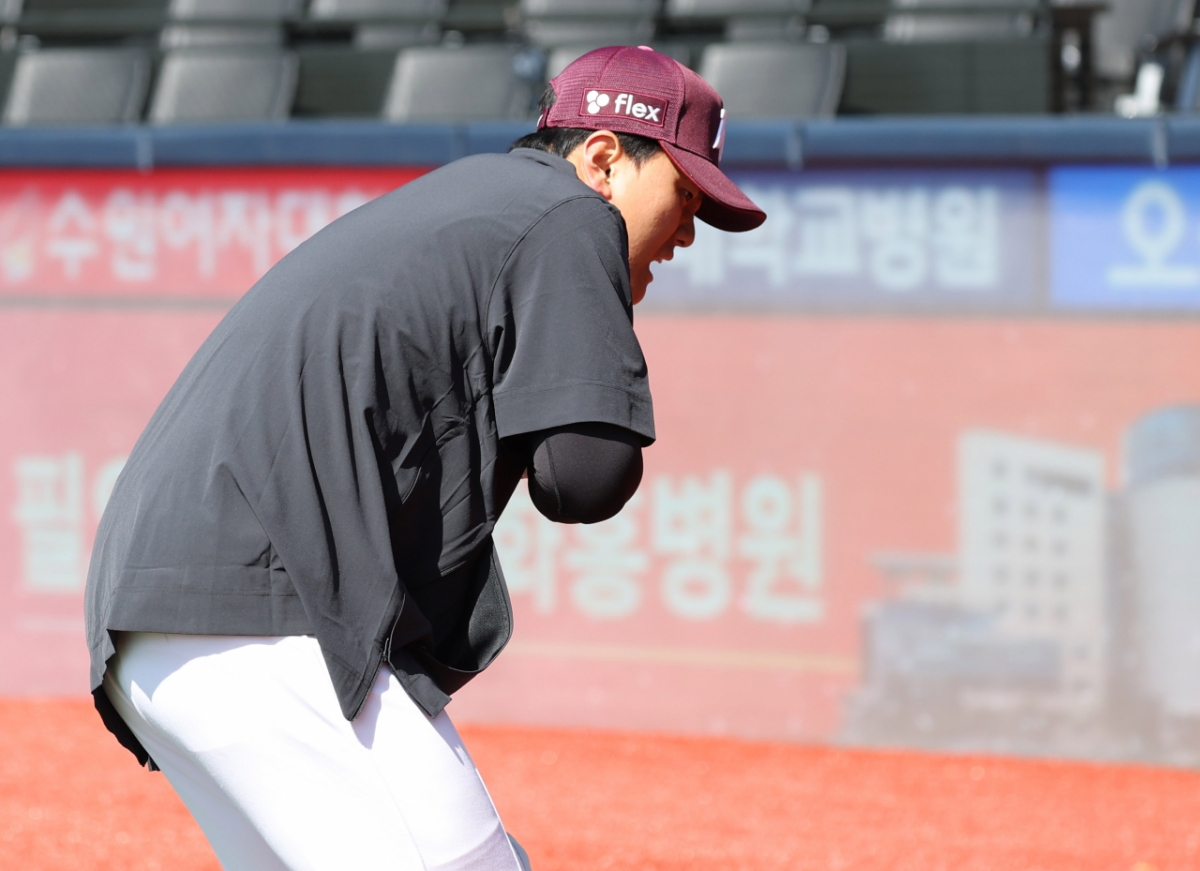 키움 김건희가 타격 훈련을 하다 어깨 통증을 호소하고 있다.