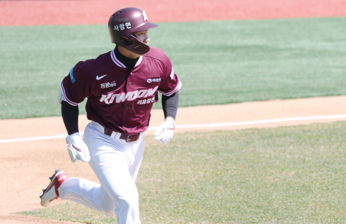 키움 이주형이 3회초 2사에서 동점 유중월 1점 홈런을 날리고 다이아몬드를 돌고 있다.