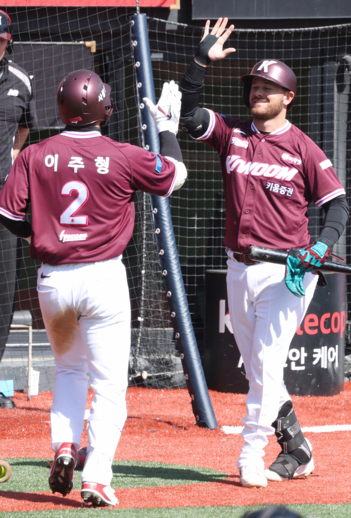 2026 신한 SOL Bank KBO리그 시범경기 KT 위즈 대 키움 히어로즈 경기가 19일 수원 KT위즈파크에서 열렸다. 키움 이주형은 3회초 2사에서 동점 우중월 1점 홈런을 날렸다. 이주형은 홈인한 후 브룩스의 환영을 받았다.