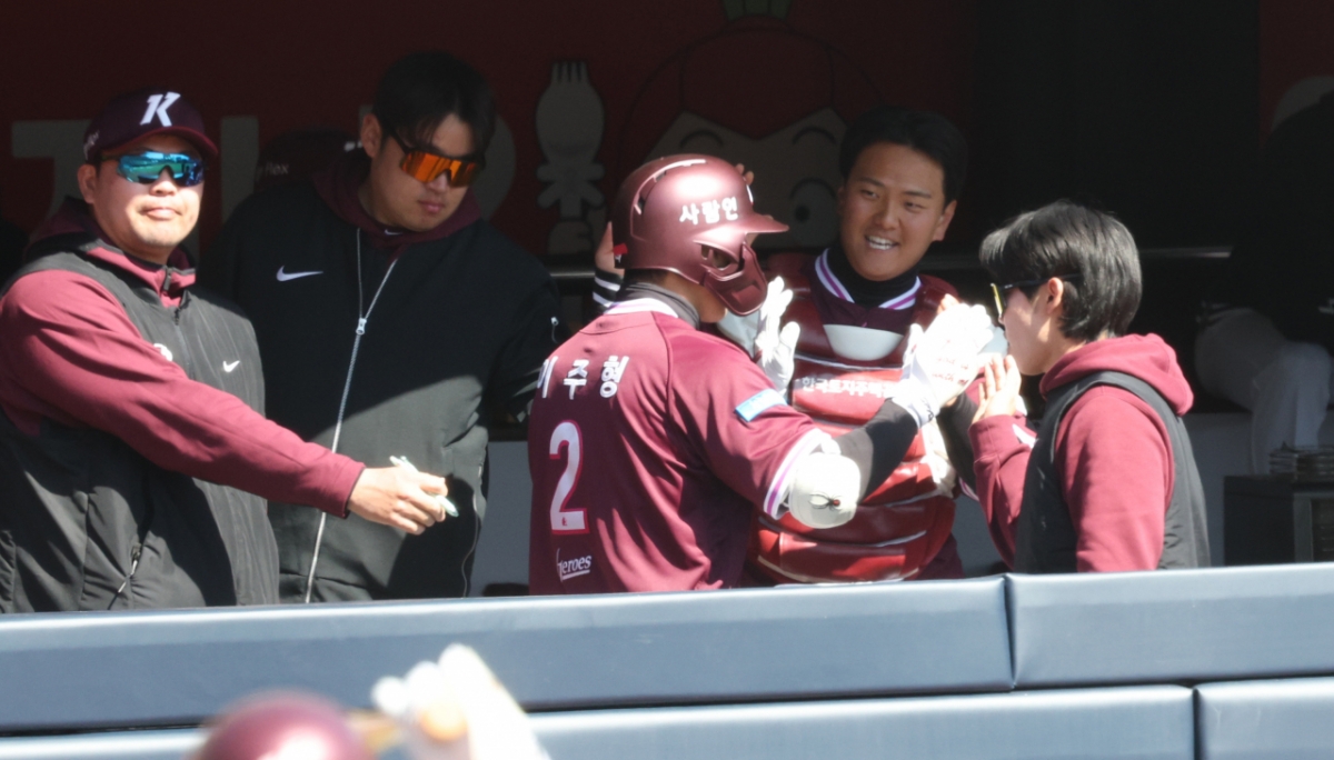 2026 신한 SOL Bank KBO리그 시범경기 KT 위즈 대 키움 히어로즈 경기가 19일 수원 KT위즈파크에서 열렸다. 키움 이주형은 3회초 2사에서 동점 우중월 1점 홈런을 날렸다. 이주형은 홈인한 후 동료들의 환영을 받았다.