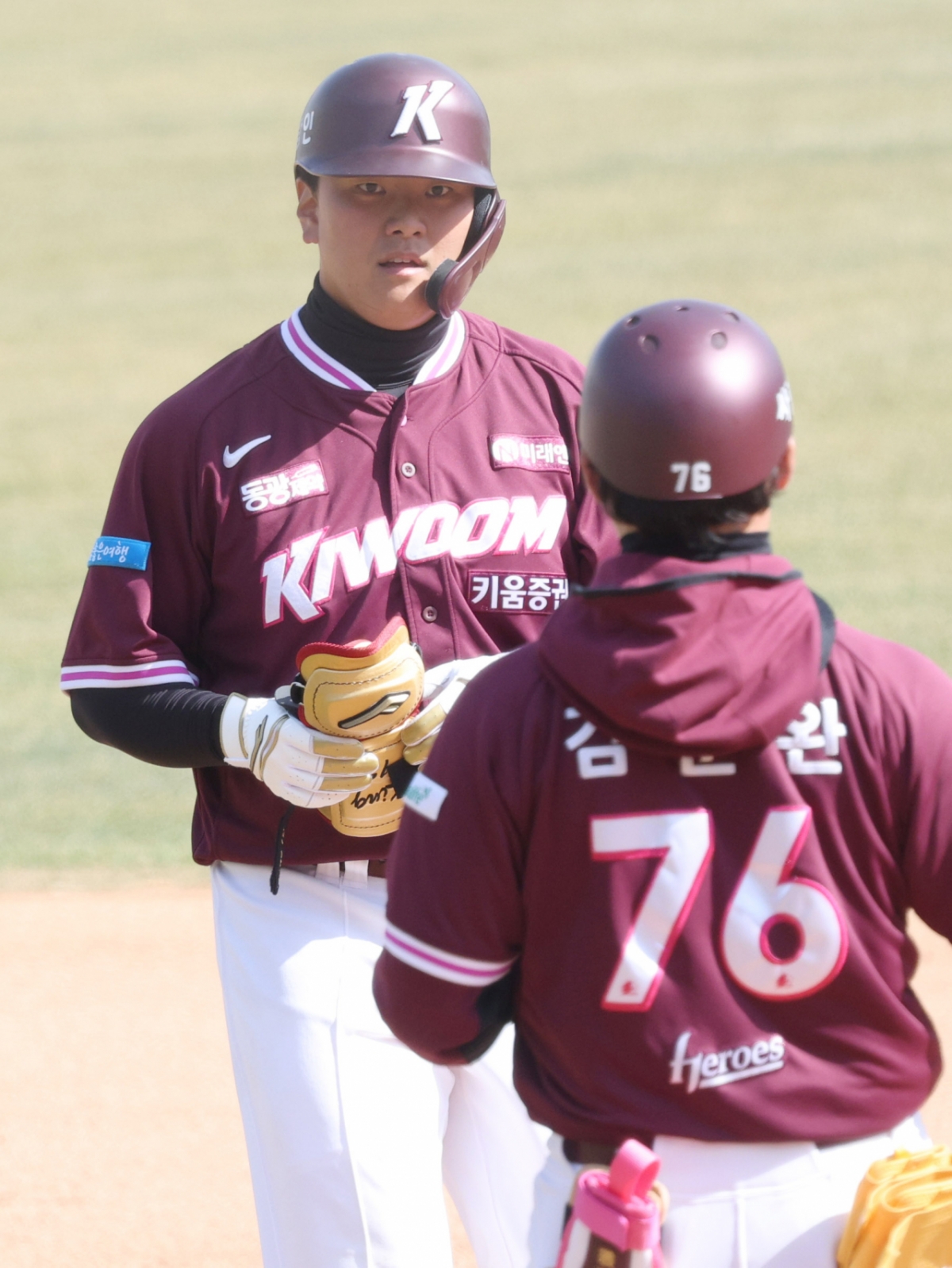 2026 신한 SOL Bank KBO리그 시범경기 KT 위즈 대 키움 히어로즈 경기가 19일 수원 KT위즈파크에서 열렸다. 키움 김건희는 7회초 2사 1,2루 상황에서 역전 2타점 적시타를 날렸다. 김건희는 출루 후 1루 코치의 환영을 받았다.