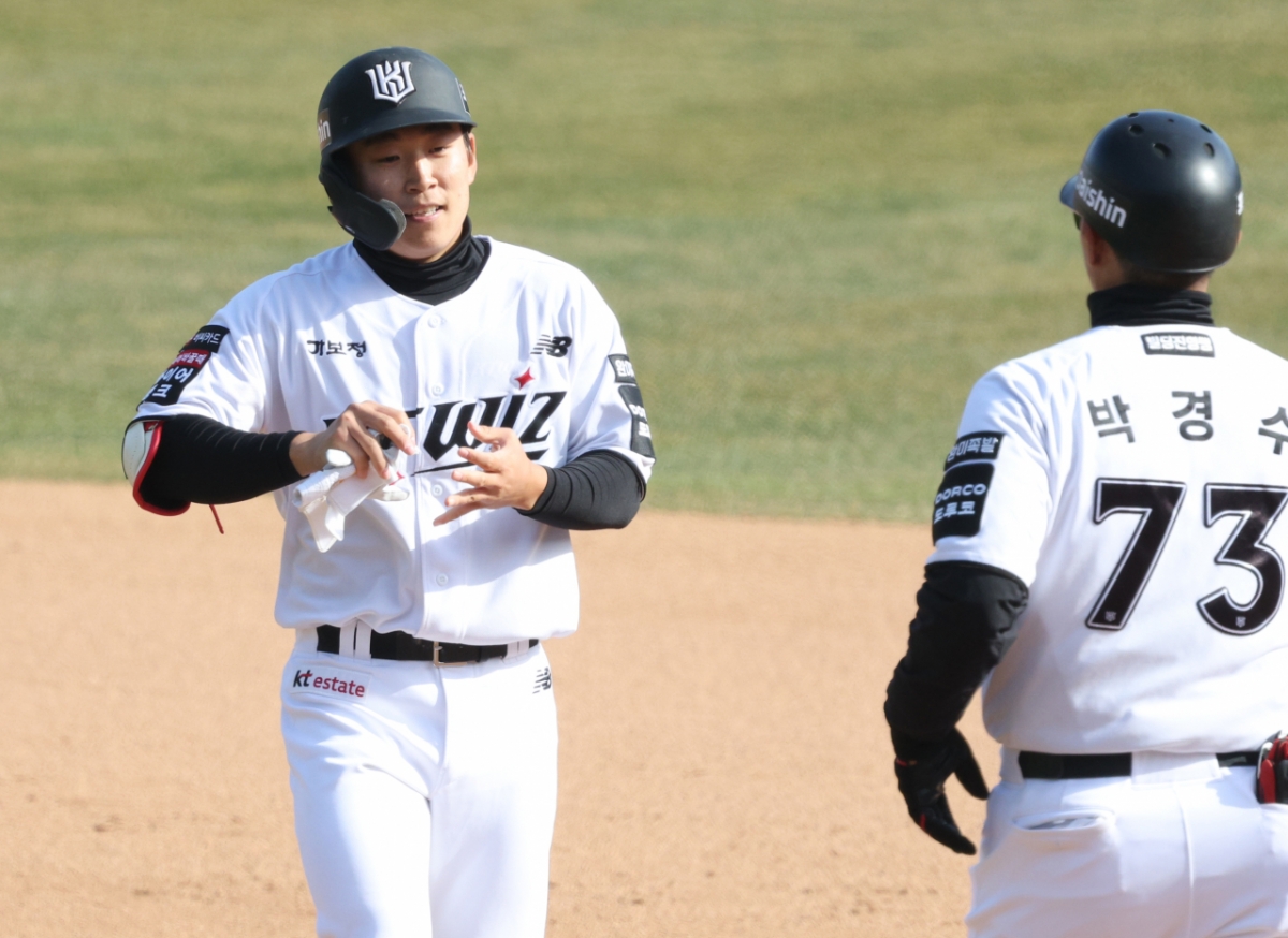 2026 신한 SOL Bank KBO리그 시범경기 KT 위즈 대 키움 히어로즈 경기가 19일 수원 KT위즈파크에서 열렸다. KT 류현인이 8회말 2사에서 우월 2루타를 날렸다. 류현인은 출루 후 박경수 코치의 환영을 받았다.