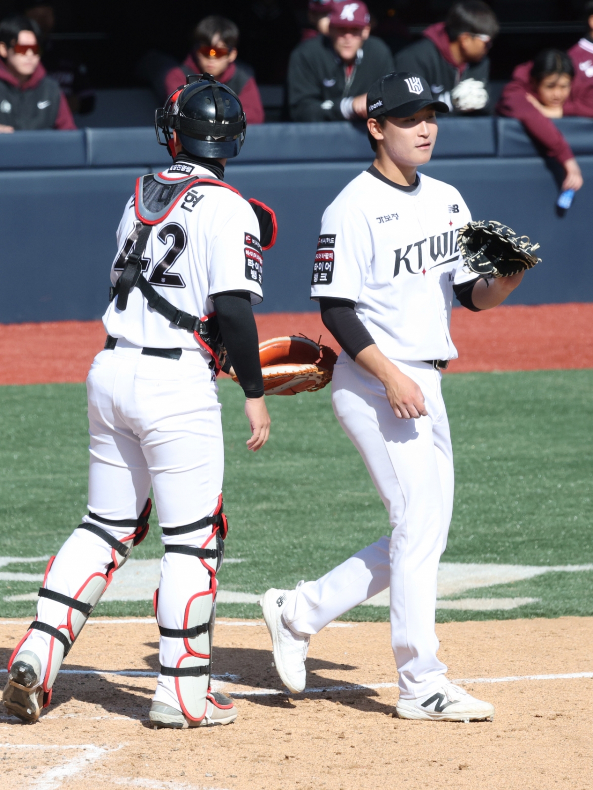 2026 신한 SOL Bank KBO리그 시범경기 KT 위즈 대 키움 히어로즈 경기가 19일 수원 KT위즈파크에서 열렸다. KT 박지훈이 연속 안타를 허용했다. 이에 포수 조대현이 박지훈을 진정시켰다.