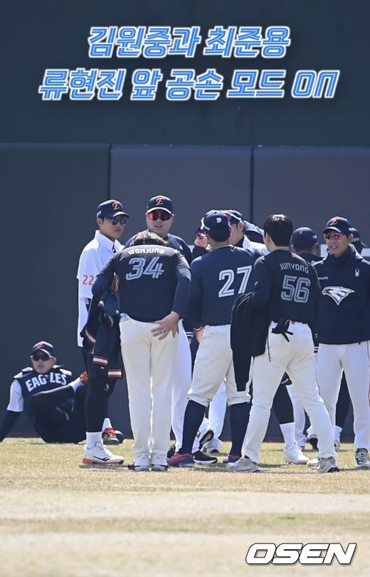 21일 부산 사직야구장에서 2026 신한 SOL KBO 리그 롯데 자이언츠와 한화 이글스의 시범경기가 열렸다. 롯데 자이언츠 김원중과 최준용이 한화 이글스 류현진과 만났다. 이들은 함께 이야기를 나눴다.