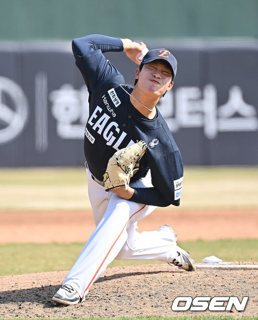 21일 부산 사직야구장에서 2026 신한 SOL KBO 리그 롯데 자이언츠와 한화 이글스의 시범경기가 열렸다. 홈팀 롯데는 로드리게스가, 방문팀 한화는 엄상백이 선발 출전했다. 한화 이글스 김도빈이 역투했다.