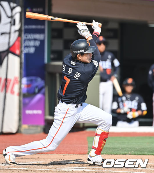 한화 이글스 심우준이 6회초 2사 2루 좌중간 1타점 2루타를 치고 있다. 2026.03.21 / [email protected]