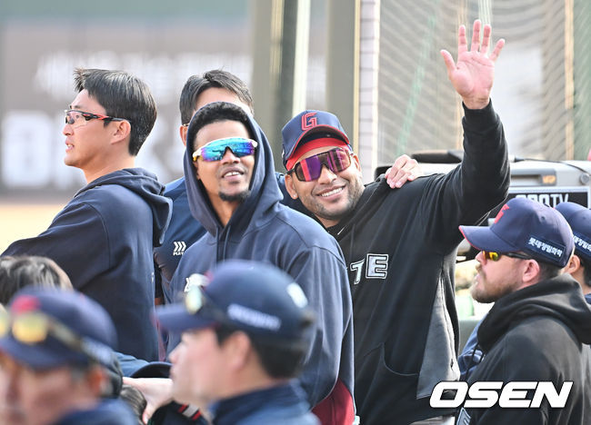 21일 부산 사직야구장에서 2026 신한 SOL KBO 리그 롯데 자이언츠와 한화 이글스의 시범경기가 열렸다. 롯데는 로드리게스가, 한화는 엄상백이 선발 출전했다. 롯데 자이언츠의 박세웅, 전준우, 로드리게스, 레이예스가 누군가를 바라보고 있었다.