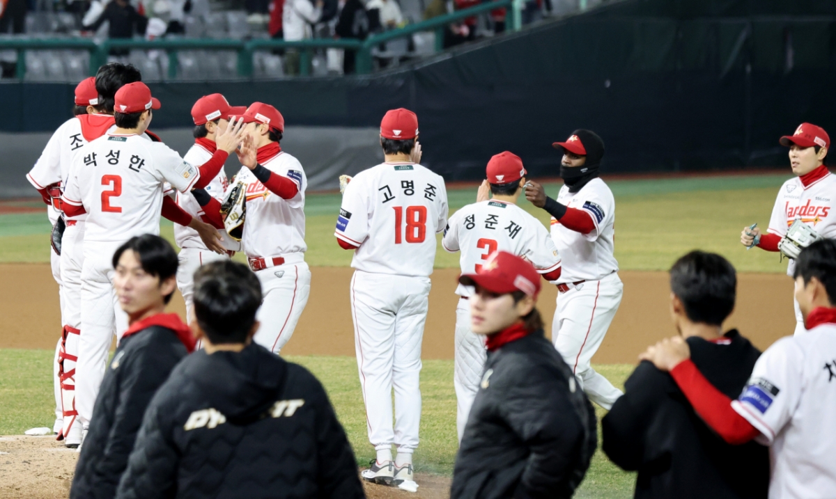 SSG선수들이 22일 랜더스필드에서 열린 1016 프로야구 시범경기 SSG랜더스와 키움히어로즈의 경기에서 승리한 후 자축하고 있다. 2026.03.22.