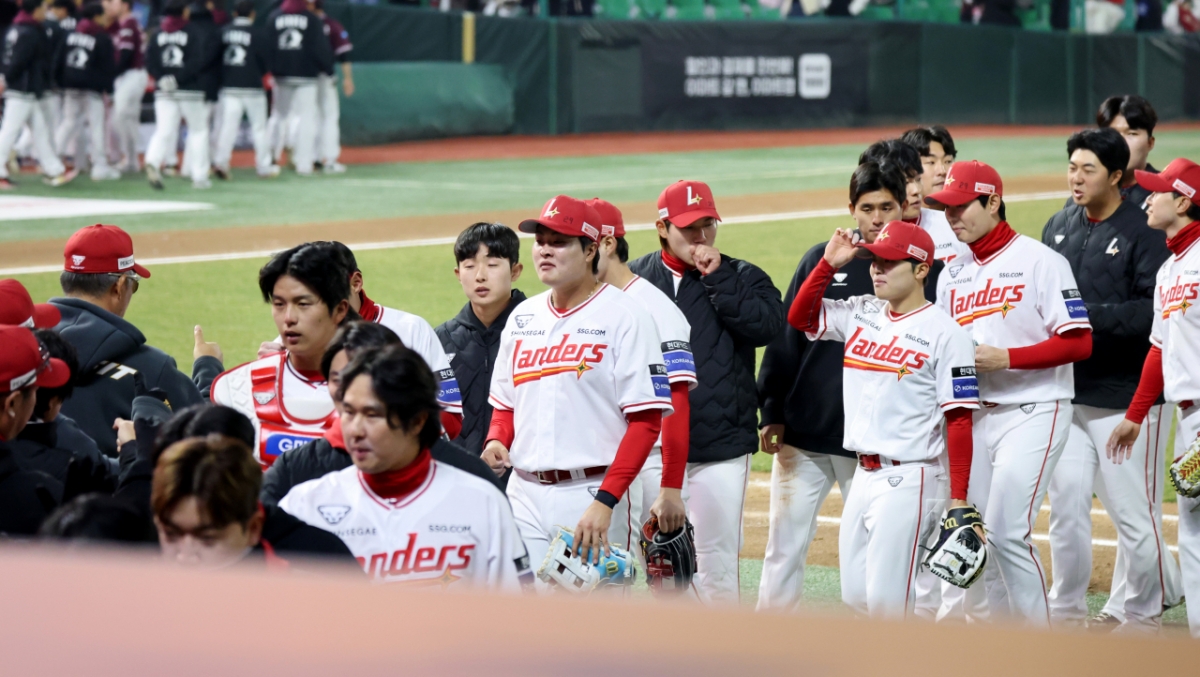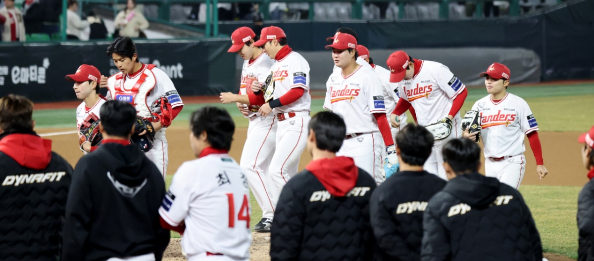 SSG 선수들이 22일 랜더스필드에서 열린 2026 프로야구 시범경기에서 키움히어로즈를 상대로 4-3 승리를 거두었다. 경기는 SSG랜더스와 키움히어로즈 간에 진행되었다. 승리 후 SSG 선수들은 자축했다.