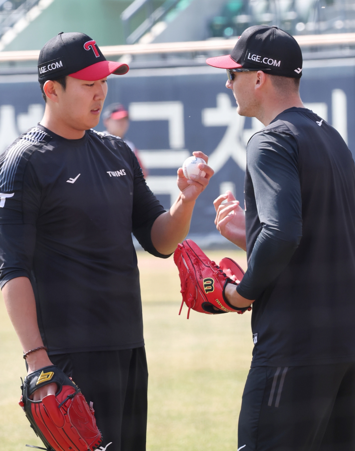 LG 손주영이 톨허스트와 대화를 하며 훈련을 하고 있다.
