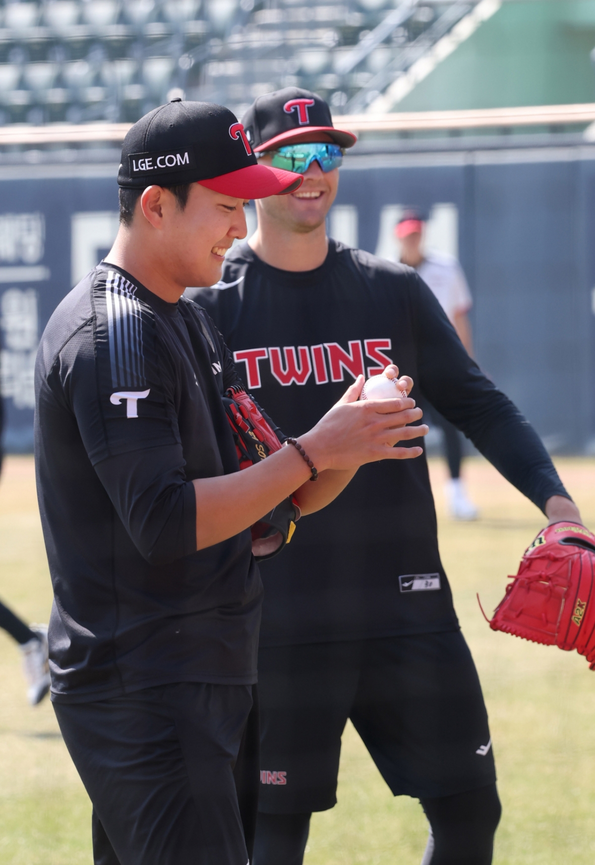 LG 손주영이 톨허스트와 대화를 하며 훈련을 하고 있다.