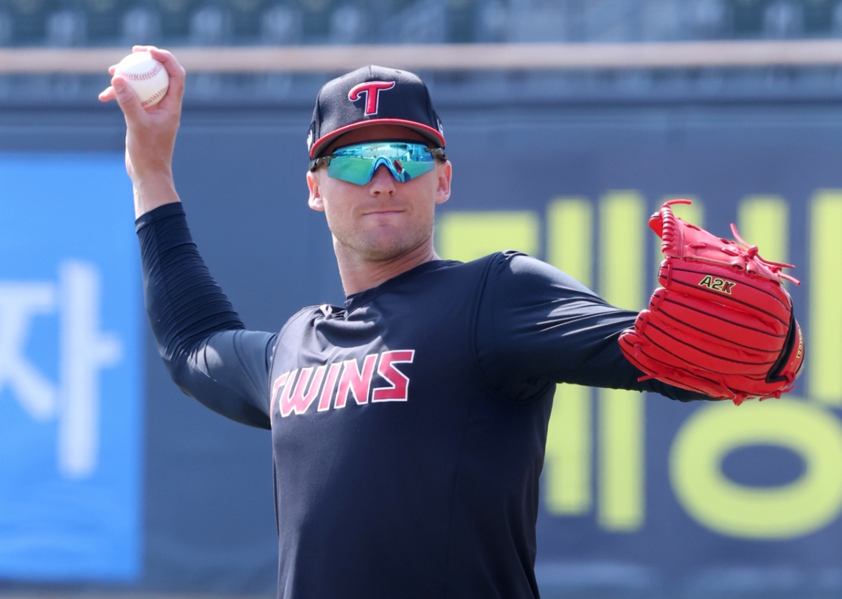LG 톨허스트가 외야에서 피칭 훈련을 하고 있다.