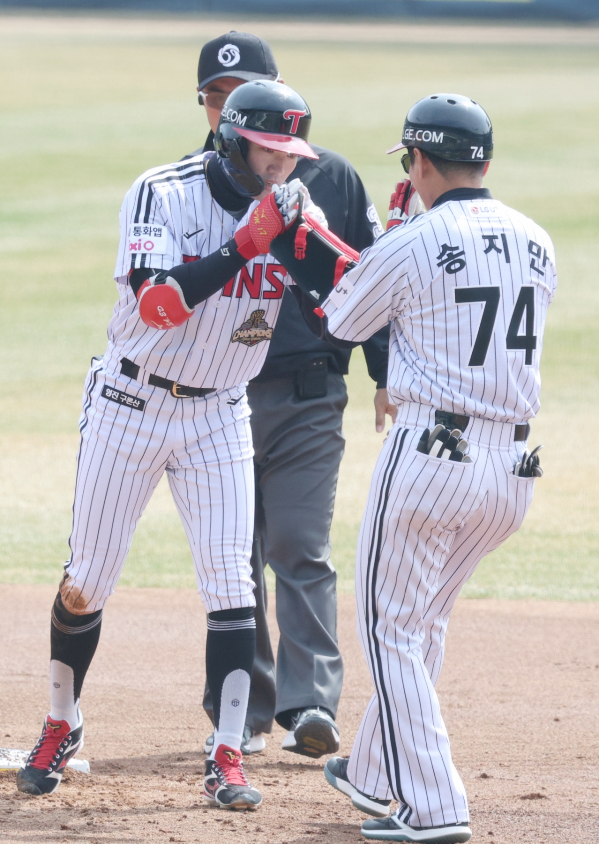 23일 서울 잠실야구장에서 2026 신한 SOL Bank KBO리그 시범경기 LG 트윈스와 키움 히어로즈의 경기가 열렸다. LG 박해민은 4회말 1사에서 좌월 2루타를 쳤다. 박해민은 출루 후 송지만 코치와 세리머니를 했다.