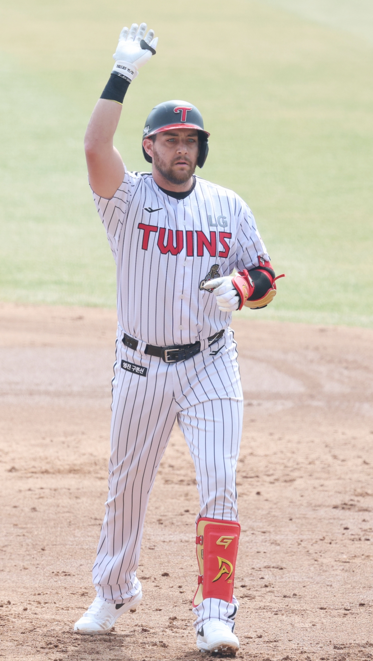 LG 오스틴이 4회말 2사 3루에서 동점 적시타를 날리고 출루한 후 세리머니를 하고 있다.