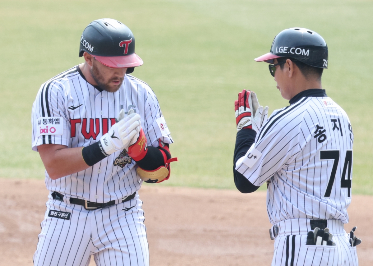 LG 오스틴이 4회말 2사 3루에서 동점 적시타를 날리고 출루한 후 송지만 코치와 세리머니를 하고 있다.